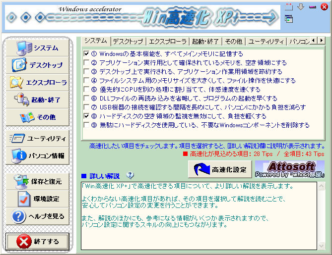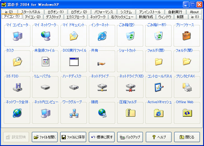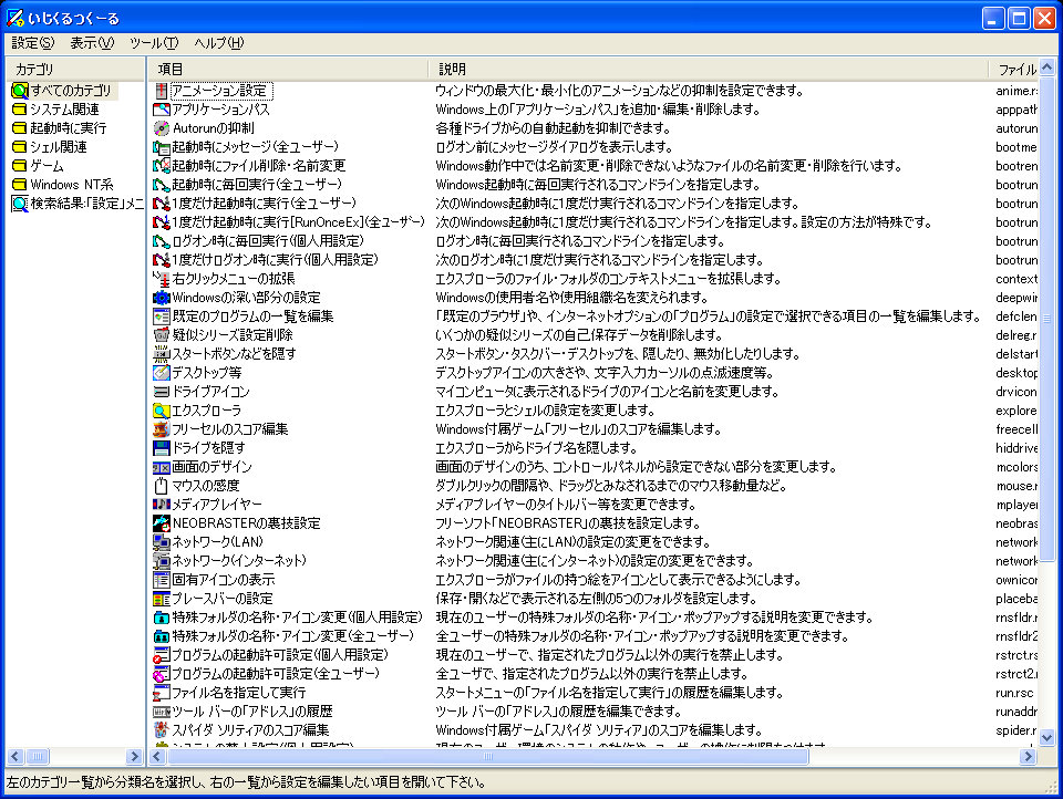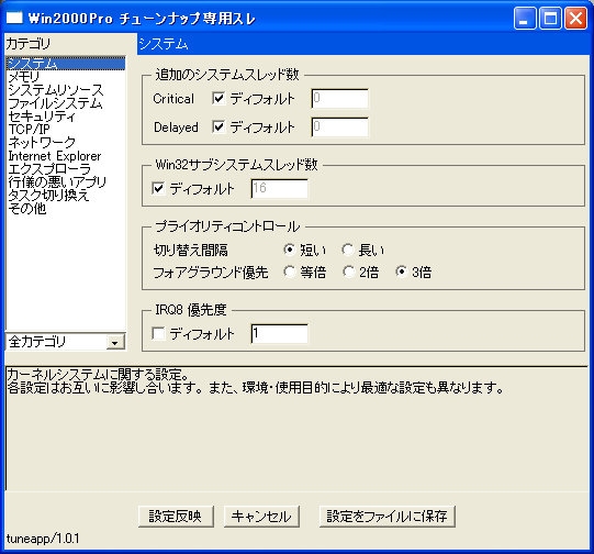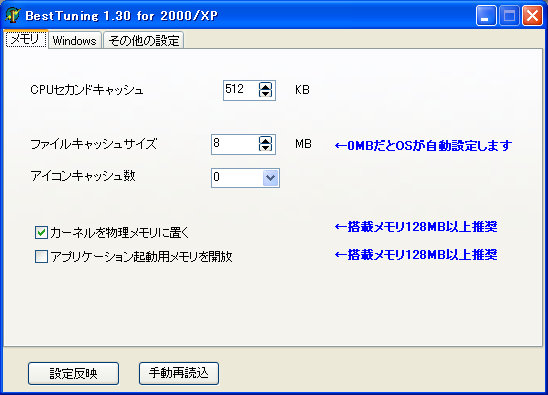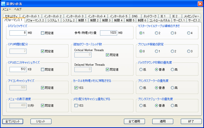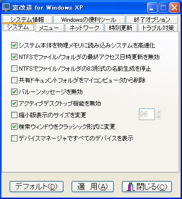Win高速化 XP+(2) つい先日バージョン1.51を紹介しましたが、もう1.6へアップしメニューが増えたようです。増えたものはカスタマイズに直接関係はないようですが、徐々に高機能化が行われているようです。 サンプル EditMTU インターネットの設定を最適化してくれるのですが、他のものは手動で行わなければならないのに対し、これは実際にDOSのpingコマンドを自動で実行し最適な値を実測して設定してくれるという理想的なものです。一度設定してしまえばあまり起動する必要はありませんが、こんな便利なものはないという部類に入るものです。最新バージョンは2.41です。 サンプル 窓使いの友 手動で実行しなければいけないのですが、レジストリーの変更設定項目は最も多いカスタマイザーです。しかし、項目を見ただけではよく分からないものが多く、設定変更にはかなりの知識を要求されます。ちょっと怖いのは標準設定に戻すボタンがあるのですが、どういう訳か戻らなかったことがあり、おかしくなってしまったことです。初心者には敷居が高いかもしれませんが、直接書き換えるよりは安心感があります。最新バージョンは2.0.4です。 サンプル (接続試験用)サンプル 窓改造 それほど高機能ではないですが、気軽に実行できます。ただし、設定項目は他のカスタマイザーと似たり寄ったりです。最新バージョンは1.03 サンプル いじくるつくーる 開発当初はWindows2000%と名乗っていたようです。その後いじくるツールとなり、バージョン7になりこの名前に変更されました。設定項目は非常に多いのですが、内容を見ると少し怖いところをいじるようになっているので、私も動作させることを躊躇してます。以前肝心のことができなくなり相当焦った経験がトラウマのようになってしまっています。内容的には、高速化を最大の目的としたものではないようです。最新バージョンは7.12.15です。 サンプル Bootvis(1) Microsoft謹製のカスタマイザーで、主な使用目的はOSの起動を高速化するものです。動作させると再起動することになり、その後他の環境が起動した後しばらくしてからオプティマイズ動作に入ります。時間が結構かかりますが、フリーズしているわけではないのでそのまま放っておくといつの間にか自動的に終了します。効果のほどは環境によりますが、かなり有るようです。最新バージョンは1.3.37.0 BestTuning for 2000/XP ほんのちょっとした設定変更をやってくれるもの。最新バージョンは1.30 サンプル 窓の手(2) 最新のバージョンは、6.52 Beta4 です。(2004/06/05現在の最新バージョン) サンプル tuneapp これもマニアでは、有名なカスタマイザーです。私は、動作させたことはありませんが。最新バージョンは、1.0.1です。 サンプル 以上とりあえず思いつくままにあげてみました。もう少しあるのでそれは次回に。 |