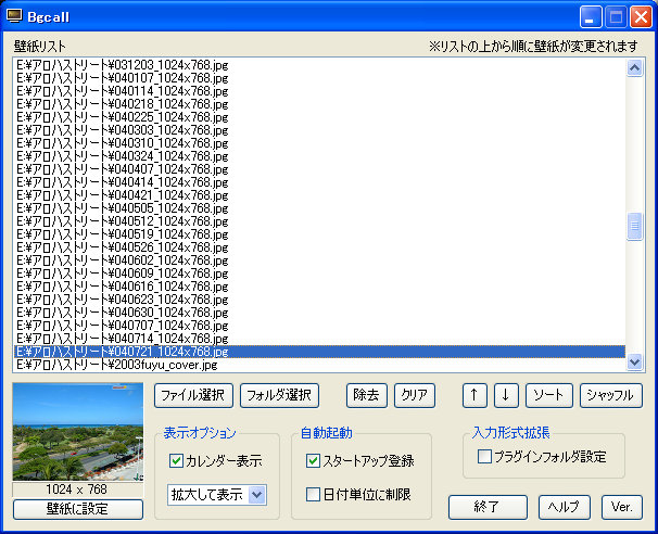 所謂壁紙チェンジャーですが、この種の物はもの凄くたくさんあり、それぞれがいろんな特徴を持っているものと思われます。自動的にチェンジするのにはWchangerを使用していますが、手動でのチェンジは、こちらの方が操作し易いようです。また、JPGその他にも対応しているところや非常駐型であるところもグッドです。 入手は次のURLからどうぞ。 サンプル http://www.vieas.com/soft.htm |