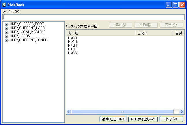 レジストリーをバックアップしてくれるアプリです。OS標準のものでもエクスポート(書き出し)が可能ですが、これは各キーを独立して一度に書き出してくれるところが便利です。復元機能は特に有りませんが、保存された*.regファイルを右クリックして統合を選べば復元できます。 以前一度使ったときは、使い方がいまいち分かりませんでしたが、今回知る機会が有りましたので、紹介しておきます。 入手は次のURLからどうぞ。 サンプル http://www5.plala.or.jp/igjhmc/freesoft/index.html |