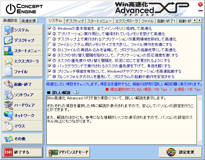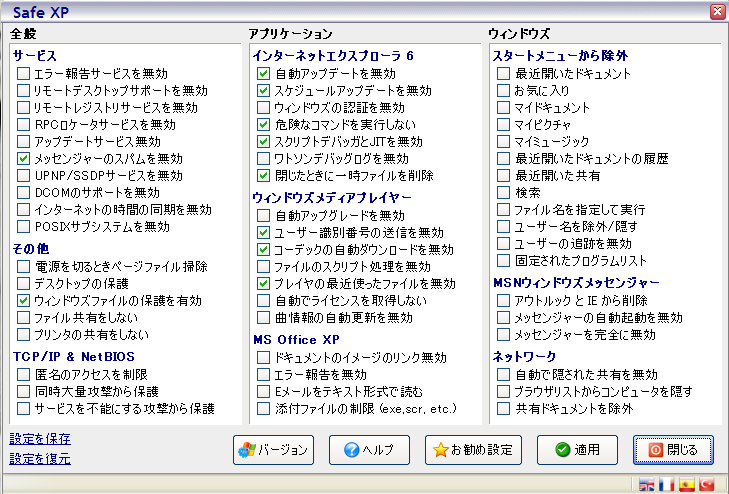 以前紹介したWin高速化 XP+の後継アプリ。最近はやたらなカスタマイズはしなくなりました。何でもそうですが、過ぎたるは及ばざるがごとしで、かえって不安定にもなります。ちょうどバランスがとれたところでやめるのが鉄則です。 以前のものよりも、機能は強化されています。有料版もあり、こちらはもっと高機能ですが、不要なものが多そうなので、フリー版で十分と思われます。 入手は次のURLからどうぞ。 サンプル 参考サンプル (有料版追加 : 2004/12/15) http://www.asahi-net.or.jp/~vz6t-iwt/operation.htm#download |