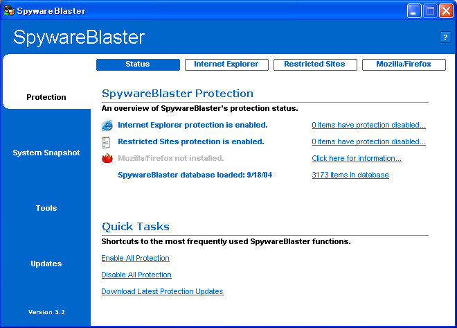 これは私自身かなり以前にインストールしていましたが、情報が不足していたせいか、いまいち効果が分からなかったものです。それが最近、図らずもJ-Word問題の解決に頭を悩ませていたときに、その効果がやっと分かったというものでした。 それは、これを入れて設定をオンにすることによって、自動的に大量の危険サイトがIEの制限付きサイトに登録されるというものでした。その結果、J-Wordを採用しているページへアクセスすると警告画面が現れ、危険といわれるActiveX Controlをインストールしないと正常に表示されない旨のダイアログが表示されるようになります。このダイアログは、手動で閉じなくてはならず、通常のブラウジングでは非常に煩わしいものです。幸い私が使用しているブラウザのDonut Pはこれを自動的に閉じるように設定が可能です。 このように、WEBサイトには危険がいっぱいです。快適さを多少犠牲にしても、安全には変えられません。J-Wordそのものは、現在のところ危険なものかどうか確定はしていませんが、先に紹介したAd-awareでもスパイウェアとして登録されているので、できればActiveX Controlも含めて、インストールしない方がいいと判断しています。 もちろん他にも危険なサイトは、特に海外にはウヨウヨしてますから、安全にブラウジングするためにも、SpywareBlasterを使用することをお薦めします。使用方法は、画面のEnable All Protectionをクリックするだけです。その後は、そのまま終了してかまいません。 入手は次のURLからどうぞ。 サンプル http://www.javacoolsoftware.com/spywareblaster.html 参考サイト bottom dead center |