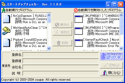スタートメニューの中にあるもの以外のスタートアップは、WinXPの場合MSCONFIGによってオンオフが可能ですが、表示名が簡略化されているため、いまいち何なのか分かりづらいところがあります。その点、このアプリを使うと可能な限り会社名等まで表示してくれるので、何のスタートアップかよく分かり、止めても問題ないかどうかの判別がしやすくなります。 同様の操作は窓の手でもできますが、データが詳しく表示されるこちらの方が非常に使いやすいといえます。また、オフを適用してもMSCONFIGと違って、再起動を要求してこないところなども好感が持てます。 入手は次のURLからどうぞ。 サンプル http://hp.vector.co.jp/authors/VA029465/ols_sup.html |
