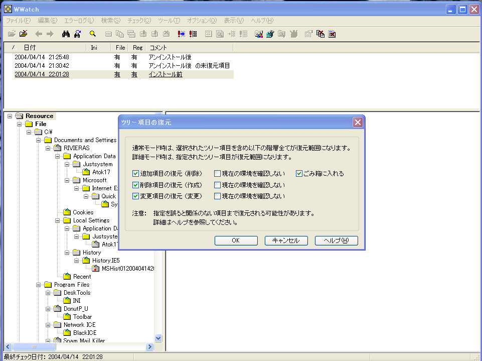 久々にシェアウェアとして素晴らしいものを紹介します。これは、アプリをインストールするときに環境を記録し、アンインストール後に元の環境に復元してくれるものです。作者はSRCpy for WIN32(こちらはフリーウェア)の作者でもあり、なかなか優秀なコンセプトの持ち主です。難点は操作がわかりにくいことでしょうか。なにも情報を持たずにとりあえず起動しても、何がなんだか分からないので、即刻使用中止したくなるところ。しかし、機能を理解しさえすれば、かなり有用なアプリといえます。 入手は次のURLからどうぞ。 サンプル http://hp.vector.co.jp/authors/VA005888/ |