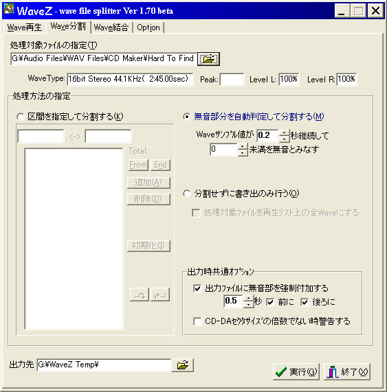 最近MXでDLするものの中に、アルバム全曲をひとつのファイルにしたものを見かけます。まとめてDLできるのはいいのですが、聴くときに非常に操作しづらくなります。そこで、これをいったんSoundEngineなどを使用してWAVファイルに戻してから読み込み、自動的に曲間で分割してくれるのがWaveZです。それほど新しいアプリではないですが、WinXPでも無事動作しましたので紹介します。サンプル画面のように設定して、実行すると自動的に分割保存できます。なお、SoundEngineでも分割保存は可能ですが、この場合はサウンドの波形を見ながら手動で曲間にマーキングしてから、自動保存ができます。 入手は次のURLからどうぞ。 サンプル http://www.geocities.co.jp/SiliconValley/6144/wavez.html |