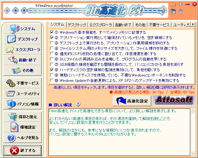 これはリリースされたばかりの、海外製のWinXP専用カスタマイザーです。日本語化パッチはまだ出ていませんが、操作はそれほど難しくありません。これまで各種リリースされている、レジストリー書き換えタイプのものに、デフラグをうまく組み合わせて高速化しようというもので、なかなかに凝ったフリーウェアです。 入手は次のURLからどうぞ。 サンプル http://www.driverheaven.net/dforce/ |