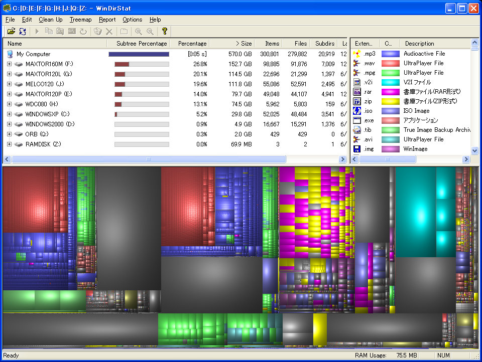 HDDの容量チェックをしてくれる海外製アプリです。気軽にチェックするにはチト重い気もしますし、日本製にもいいものがたくさんありますが、これはチェック後の画面がもの凄い画面なので、お見せしたくて紹介することとしたものです。 ある意味で、ちょっと気持ち悪いような気もしますが......。 入手は次のURLからどうぞ。 サンプル http://windirstat.sourceforge.net/ |