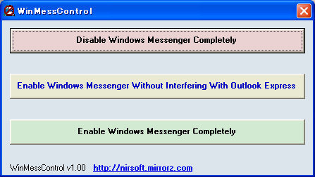 WinXPに標準で搭載され、Outlook Expressと連動して起動されるため、使用しない者にとって、ウザい代表みたいなのがWindows Messengerです。この連動をお手軽に切ってくれるアプリです。切る動作自体は他のカスタマイザーでも可能ですが、特化した3種類の動作が選べるところが気に入りましたので紹介します。 以前紹介したWinUpdatesListと同じサイトで公開されており、メニューは英語のみのようですが、お薦めはサンプル画面にあるように、真ん中部分をワンプッシュです。 入手は次のURLからどうぞ。 サンプル http://freehost14.websamba.com/nirsoft/utils/wmc.html |