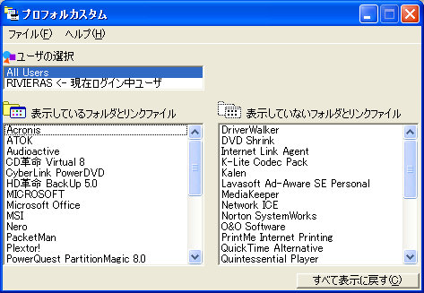 これは実にユニークなアプリです。作者は、これまたユニーク・アプリの代表選手みたいな、HTMLエンティティ生成の作者です。 使用目的は、増えすぎたスタートメニューのプログラムを非表示にしてくれるというもの。スタートメニューの整理は手動でもできますが、多段表示にしない場合、種類別にフォルダを作成し、その中に作成済みのフォルダをぶち込む必要があり、どのような種類にするか、どうすればわかりやすいかなど、結構面倒なものです。 そこで、ほとんど使わないけど、アンインストール情報が入ったものは消したくないというとき、いったんこれを使用し、非表示にしておいて、必要になったとき元に戻すという使い方ができるようになります。 これで、必要なもののみを表示させたスタートメニューができあがります。スタートメニューをランチャー替わりに使っている方に超お薦めです。 入手は次のURLからどうぞ。 サンプル http://ab.jpn.ph/soft/profol.html |